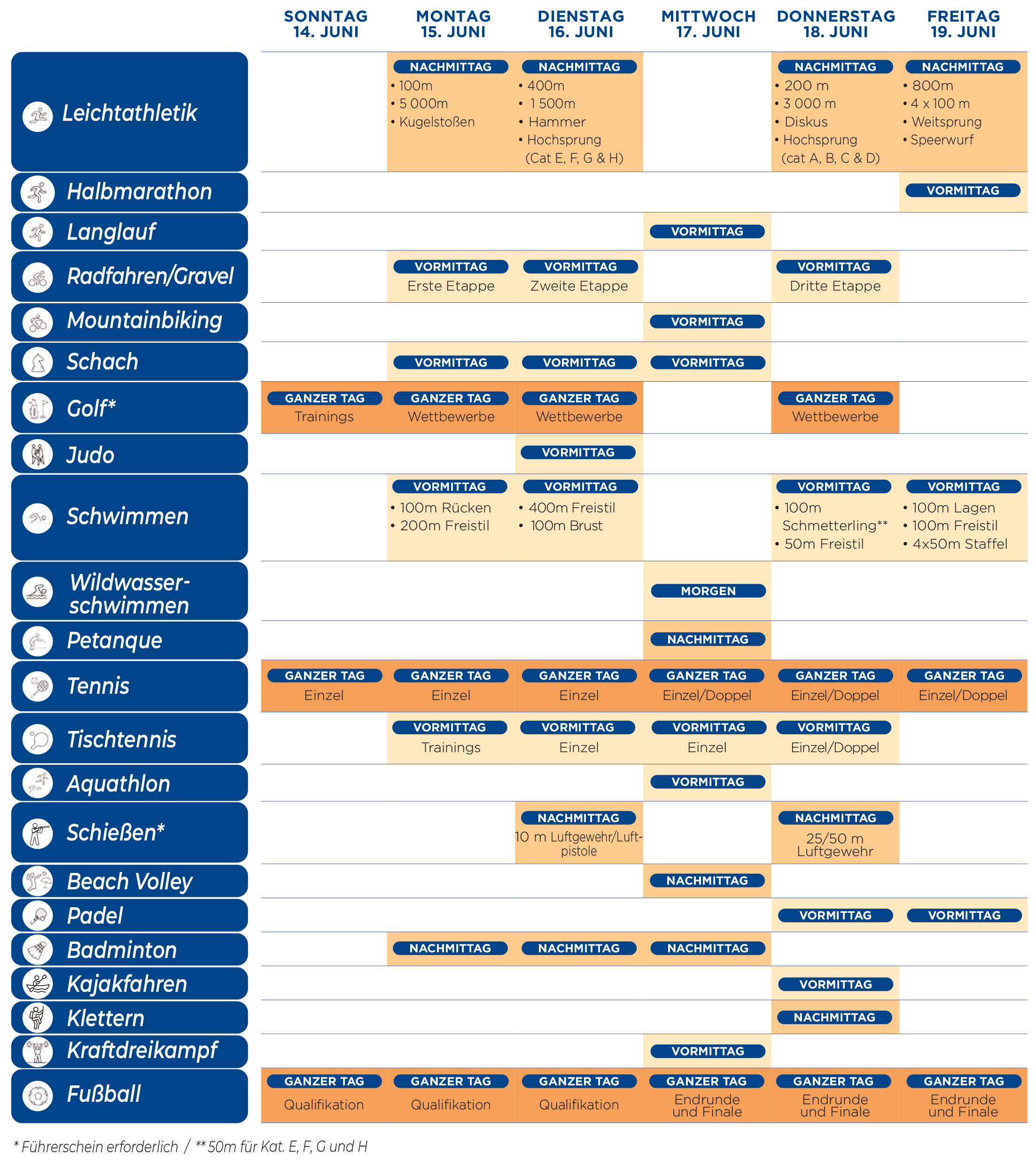 Ihre Wettkämpfe nicht zeitlich überschneiden.