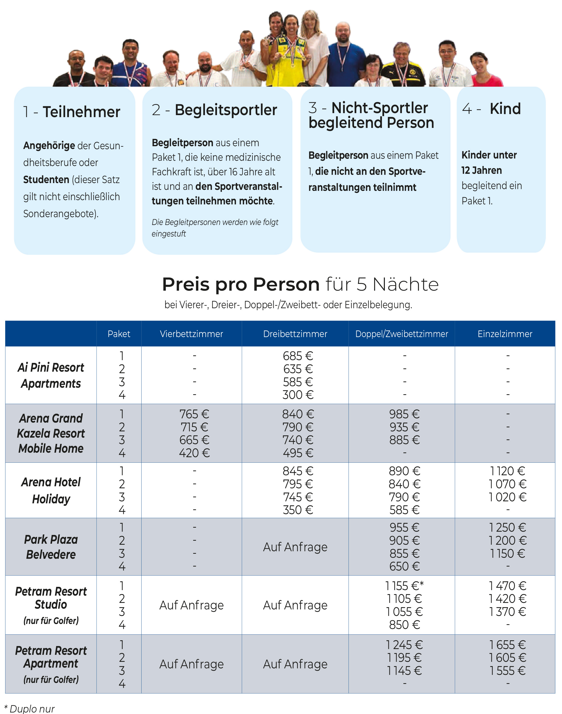 Bitte buchen Sie keine Unterkunft auf eigene Rechnung. Die Teilnahme an den Sportweltspielen der Medizin und Gesundheit ist nur mit einer Hotelbuchung über den Veranstalter möglich. Sie finden die Konditionen der Hotels ab Anfang Dezember in der Broschüre und auf dem Anmeldeformular.